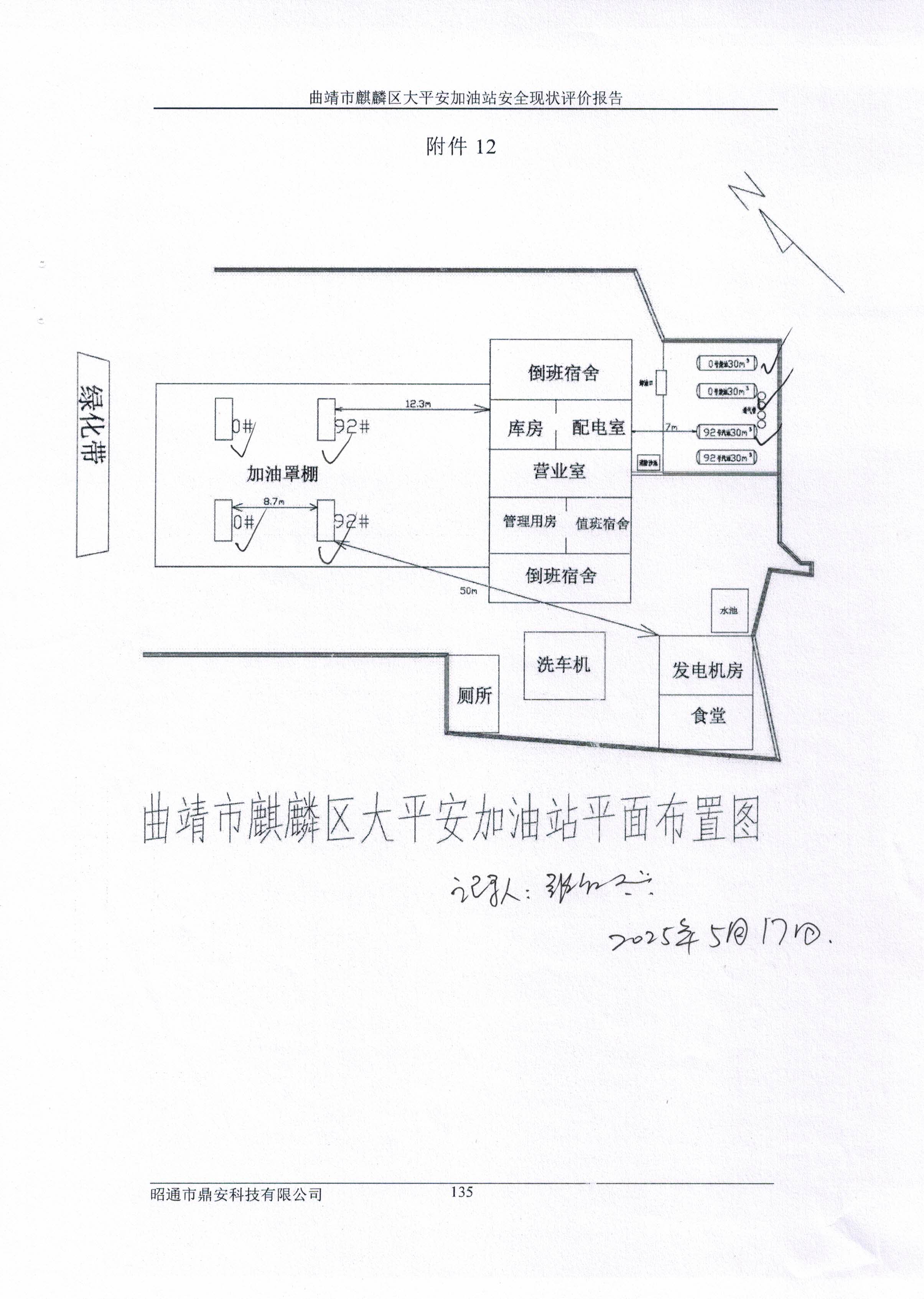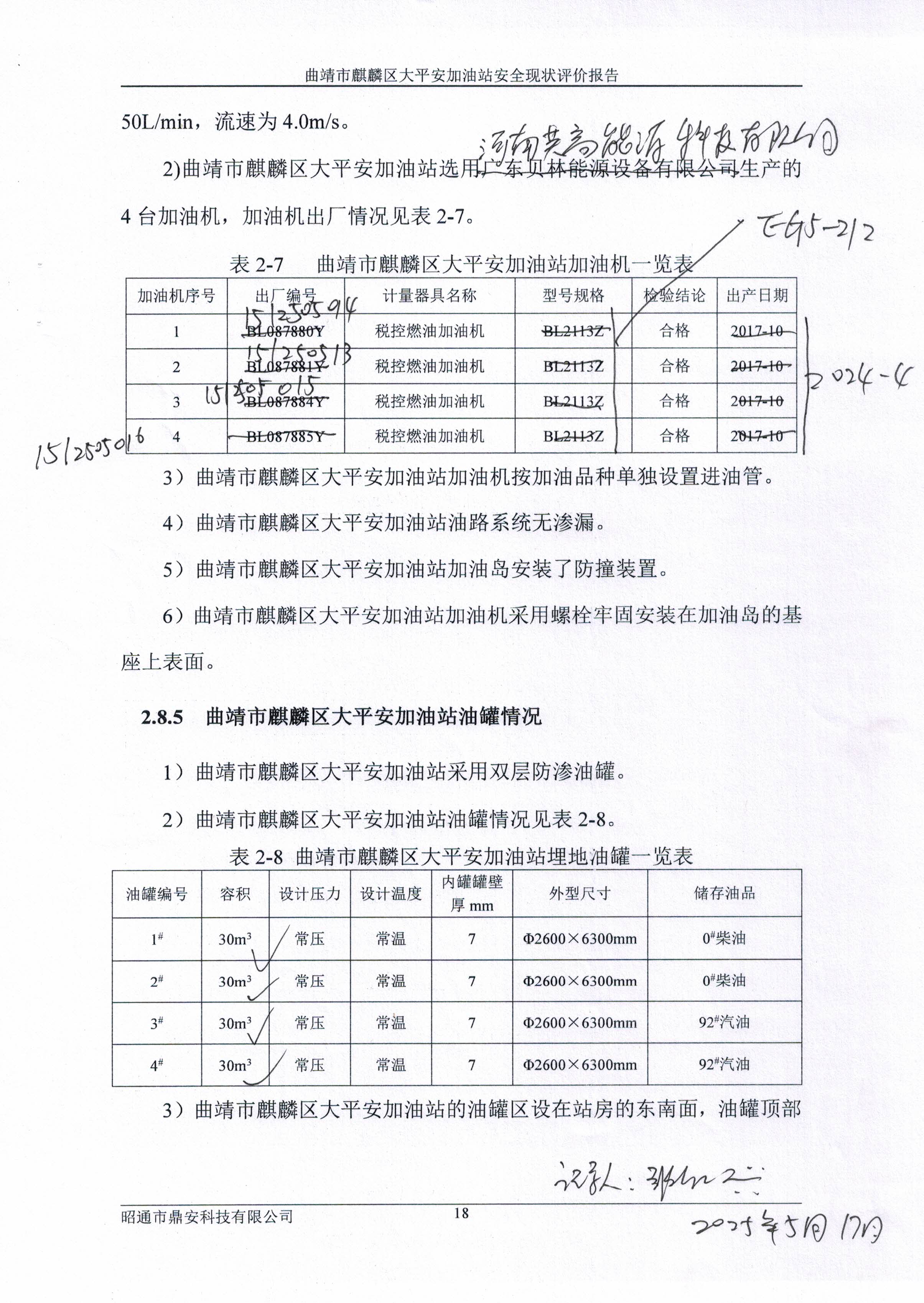 評價結(jié)論為:曲靖市麒麟?yún)^(qū)大平安加油站已完成本次評價發(fā)現(xiàn)的不符合項整改,站址選擇及平面布置、加油工藝及設(shè)施、消防設(shè)施、電氣及報警系統(tǒng)、建(構(gòu))筑物等方面符合《汽車加油加氣加氫站技術(shù)標(biāo)準(zhǔn)》(GB50156-2021)、《加油站作業(yè)安全規(guī)范》(AQ3010-2022)標(biāo)準(zhǔn)規(guī)定;經(jīng)營場所、危險化學(xué)品儲存設(shè)施、人員配置及培訓(xùn)考核、安全管理制度、安全操作規(guī)程、應(yīng)急預(yù)案、應(yīng)急物資滿足《危險化學(xué)品安全管理條例》(國務(wù)院令第591號,第645號修改)第三十四條、《危險化學(xué)品經(jīng)營許可證管理辦法》(原國家安監(jiān)總局令第55號公布,第79號修正)第六條要求,從安全的角度曲靖市麒麟?yún)^(qū)大平安加油站具備危險化學(xué)品經(jīng)營的安全條件。 | ||||||||
