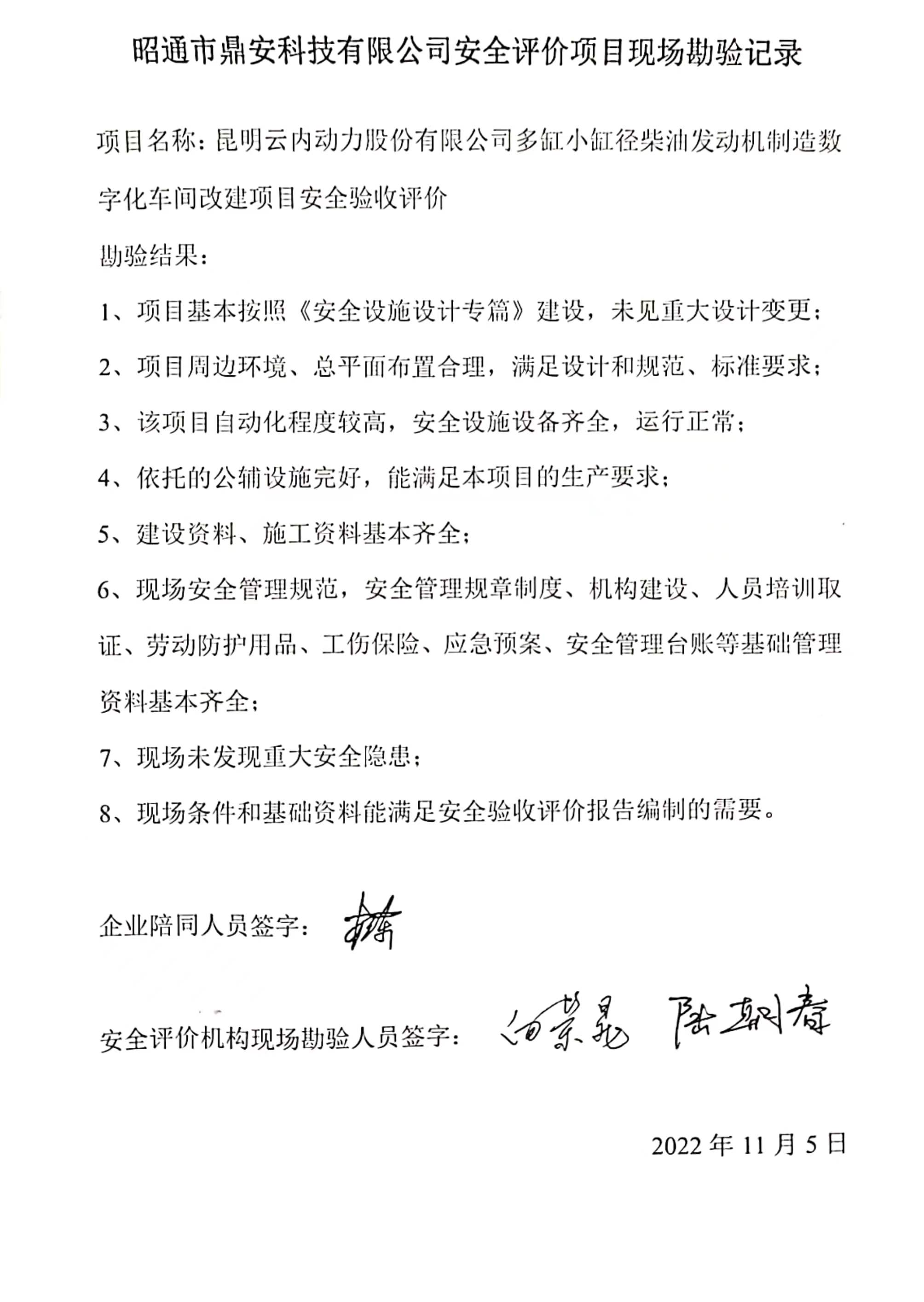 項(xiàng)目名稱 | 昆明云內(nèi)動(dòng)力股份有限公司多缸小缸徑柴油發(fā)動(dòng)機(jī)制造數(shù)字化車間改建項(xiàng)目安全驗(yàn)收評(píng)價(jià) | 合同編號(hào) | DAAPKM2022-78 | |||||